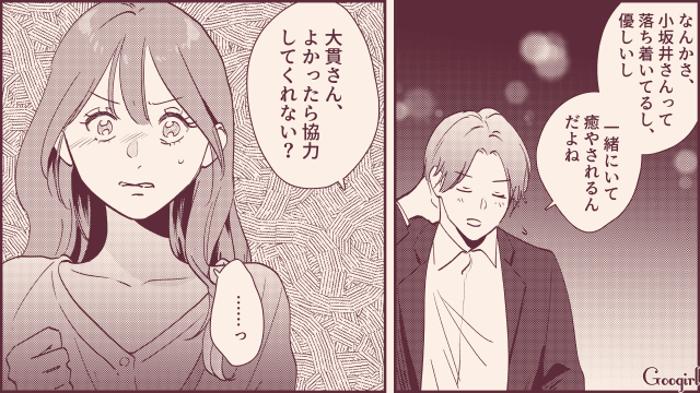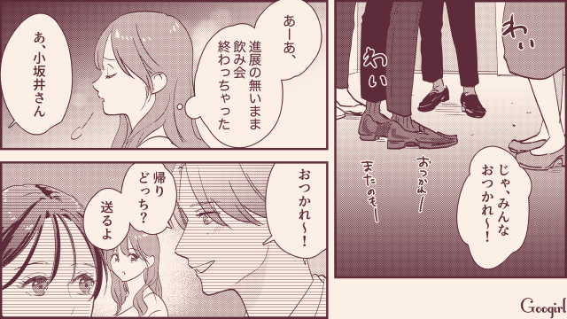 ▽ 飲み会の帰り道、ここぞとばかりに哲也に甘えるエリカ。しかし哲也の口から告げられたのは「小坂井さんが好き」という衝撃の本音。あんな女のどこがいいの!? とショックを受けるエリカに対し、哲也は「協力してほしい」と畳みかけるのでした。エリカはここから巻き返すことができるのでしょうか?