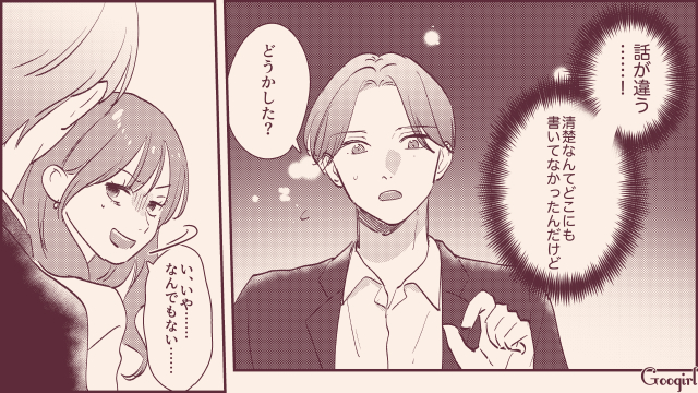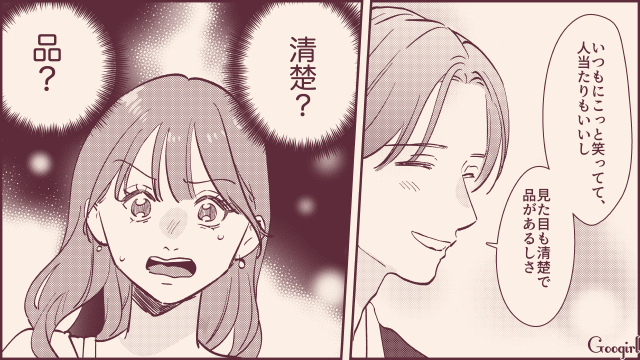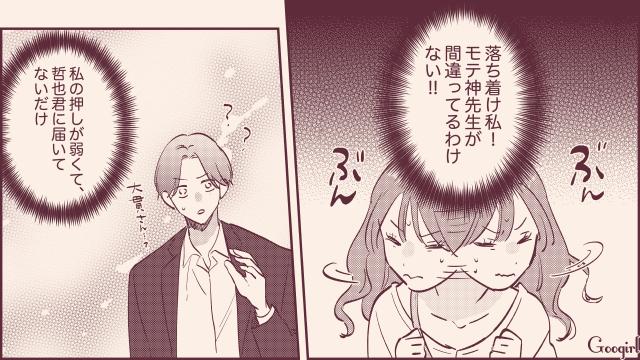 ▽ 哲也の話を聞きながら、エリカは「モテ神先生の教え」とのギャップに動揺してしまいます。清楚? 品? 芯? どれもエリカの知る“モテテク”とは正反対。しかし「モテ神先生が間違っているはずがない!」と必死に自分を納得させたエリカは、ついに最終奥義に打って出るのでした。
