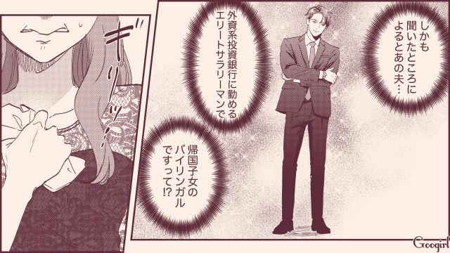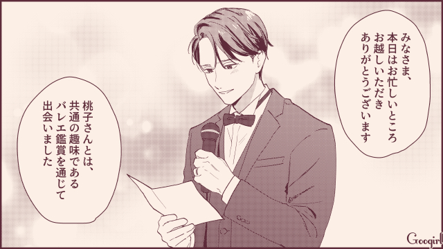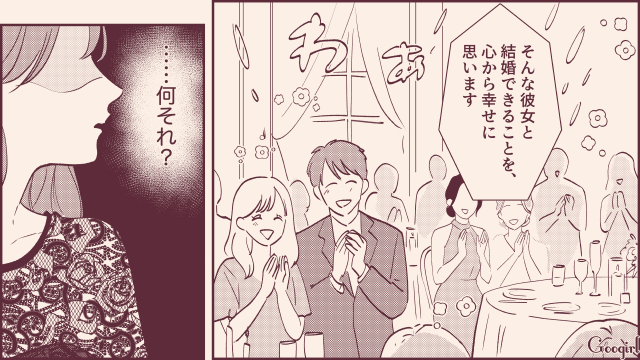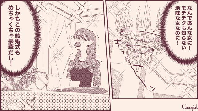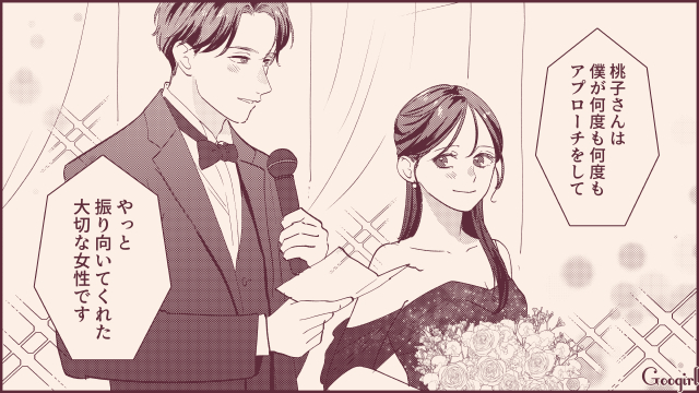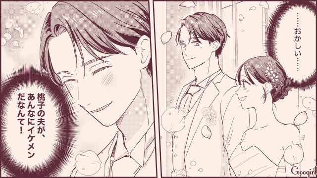▽ 桃子の結婚式に参列したエリカ。そこで目にしたのは、超ハイスペックなイケメン夫の姿でした。「なんであんな地味な女が!」と悔しがるエリカですが、新郎のスピーチを聞いてさらに驚愕することに。なんと、彼の方から桃子に猛アタックしたというのです。「モテ神先生のモテテク」とは真逆の事実に、エリカは混乱を隠せません。