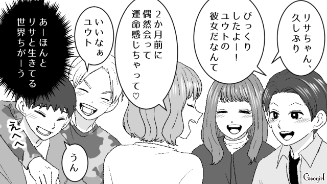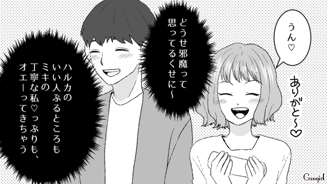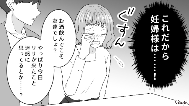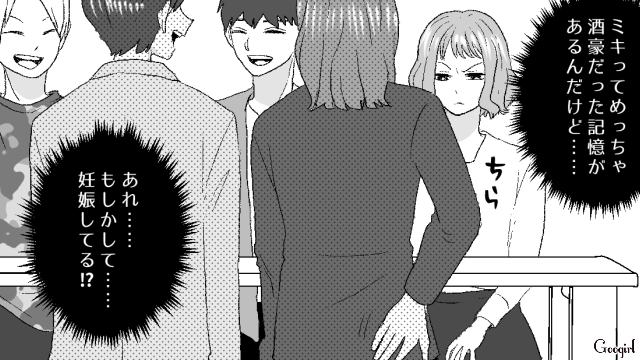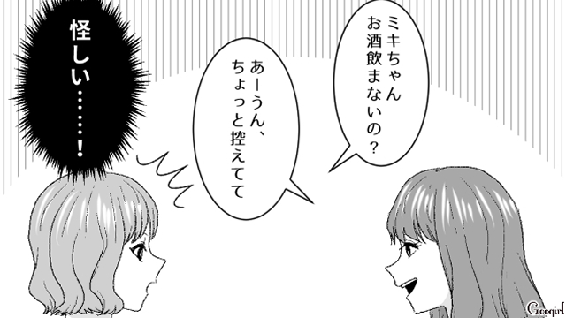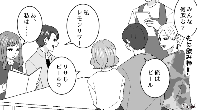 ▽ 飛び入り参加したリサを、ハルカ、ミキ、カズヤはちっとも嫌な顔をせず受け入れます。酒豪だったミキがお酒ではなくジュースを頼んでいるのを見て、リサはミキが妊娠しているのではないかと推測します。妊婦なのに飲み会に来ることにドン引きしたリサは、ミキに嫌がらせを始めます。