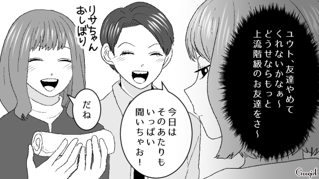 厳しい世の中で、自分から妊娠を選択した妊婦を目の敵にするリサ。付き合って2か月のユウトが、女性のいる飲み会に参加しようとするのが気に入りません。わざわざ報告してくれているので、参加する女性たちに対してユウトは恋愛感情を持っていないように見えますが、リサはついていくと宣言します。