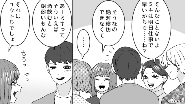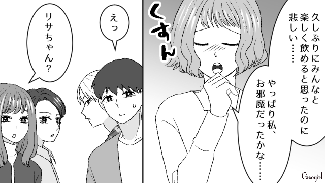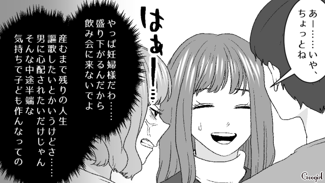 厳しい世の中で、自分から妊娠を選択した妊婦を目の敵にするリサには、付き合って2か月の彼氏・ユウトがいます。女性もいるからと飲み会に飛び入り参加したリサを、ハルカ、ミキ、カズヤはちっとも嫌な顔をせず受け入れます。酒豪だったミキがお酒ではなくジュースを頼んでいるのを見て、リサはミキが妊娠していると推測します。妊婦なのに飲み会に来ることにドン引きしたリサは、ミキに嫌がらせを始めました!