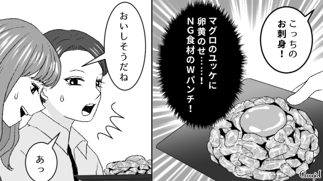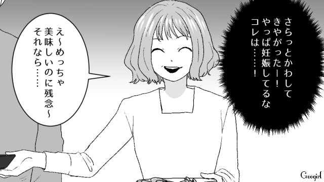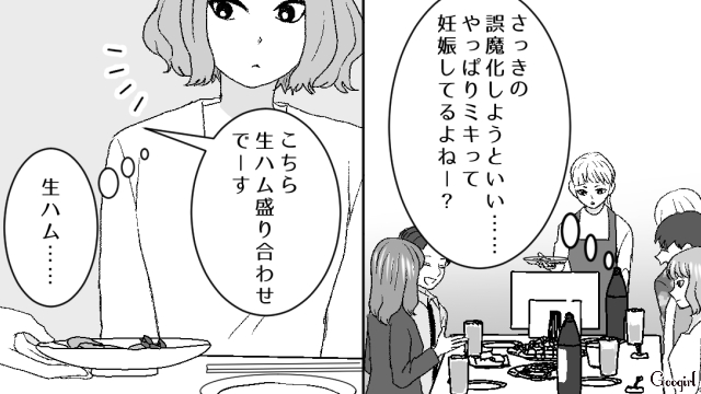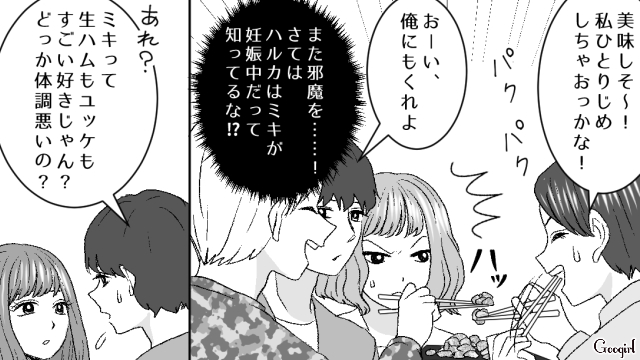 ▽ ミキが妊娠中だと怪しむリサは、妊婦にNGな生ハム、生魚、生卵をすすめます。ハルカが代わりにお刺身を食べたり、好物なはずの食べ物をミキが断る様子を見て、リサはミキが「妊婦様」だと確信します。