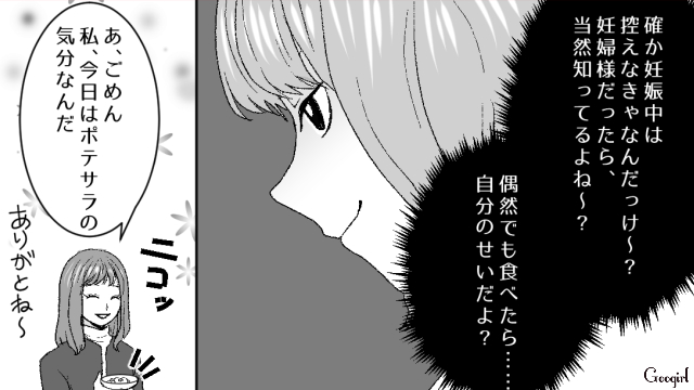 【漫画】「気づかなくてごめん♡」妊婦の友人の食事制限を無視してマウント連発した女【第3話】