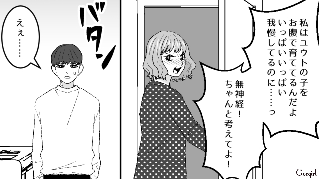 OLのリサは厳しい世の中で、自分から妊娠を選択した妊婦を目の敵にしています。体調を崩したリサが病院に行くと、妊娠3か月だとわかりました。喜ぶユウトに対して、妊娠したことに戸惑うリサ。なんとかツラい悪阻を乗り越え、安定期に入ります。今度は食べたいものを食べられない食事制限のつらさをひしひしと感じ始めました。気遣ってくれるユウトの優しさに感謝しながらも、パック寿司とお酒を見つけてしまったリサは、ついにブチギレてしまいます。