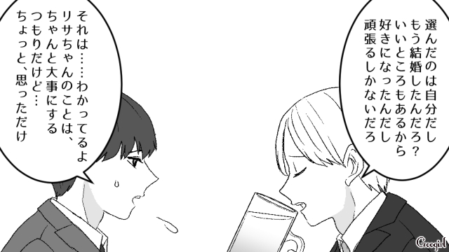 ▽ リサのごはんも作っているのにパック寿司とお酒を一緒に食べようとしただけで、キレられたユウトはさすがに疲れてしまいます。カズヤに愚痴るも頑張るしかないと言われ、さらには友達の間で、リサの行動が原因で、距離を置かれていることがわかりました。