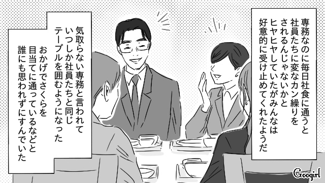 ▽ 毎日社食へ通い、さくらと会う事だけが楽しみな様子の翔平。そんな翔平を、「専務なのに気さくな人」と社員達は好意的に受け止めているようです。翔平の目的が社食のかつ丼でもカレーでもなく、パートのさくらだなんて、誰も思いませんからね。