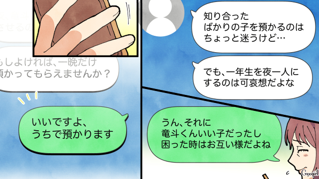 ▽ 「困った時はお互い様」と、良心から竜斗を預かることにした夏美たち。子供たちは無邪気にお泊まり会を喜んでいますが、そんな平和な光景とは裏腹に、帰り道の美玲は不敵な笑みを浮かべていました。彼女の真の狙いは、一体どこにあるのでしょうか。