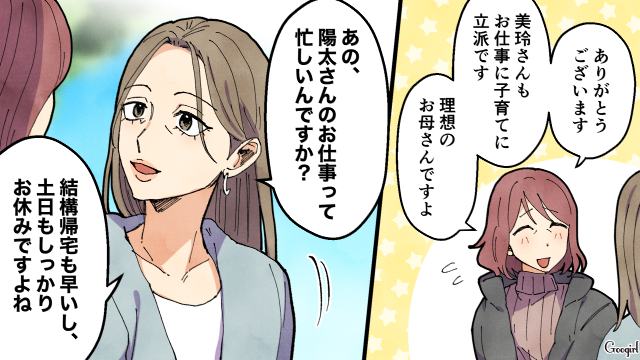 すっかり和田家に懐いた様子の竜斗と、親しげに接してくる美玲。休日に家族ぐるみで公園へ遊びに行きますが、ベンチに並んで座る美玲の口から、信じられない質問が飛び出します。ママ友という距離感をこえた彼女の言動に、夏美は戸惑いを隠せません。