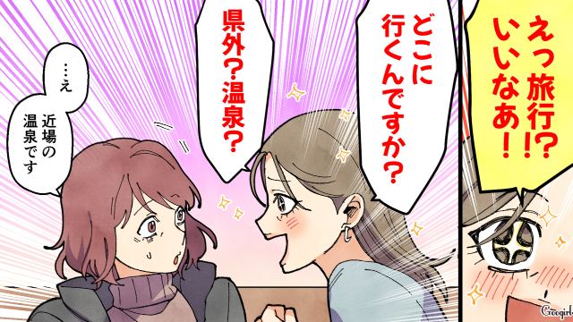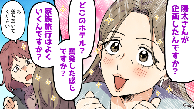 ▽ 「勤務先は?」「年収は?」と、プライベートな情報を探ってくる美玲に、引いてしまう夏美。さらに週末の家族旅行の予定を伝えると、美玲の羨望はさらにヒートアップします。質問攻めの裏に隠された、彼女の暗い情熱と執着心。無事に旅行できるといいのですが……。