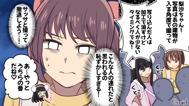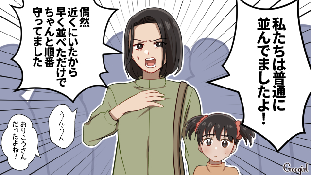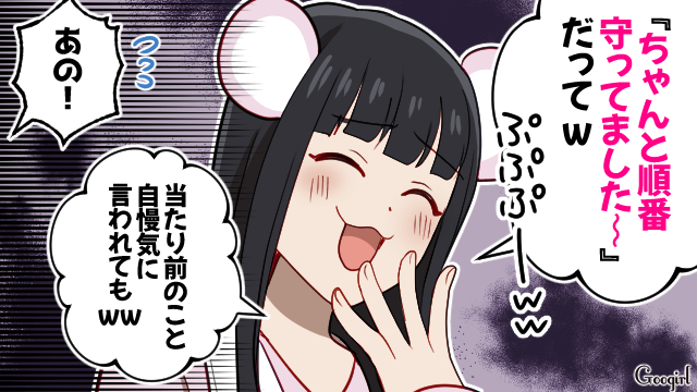 テーマパークでキャラクターが登場し、写真撮影のため列に並ぶ人々。しかし害悪オタ美帆乃は順番を守らず、小さい子どもを押しのけて人気キャラ「グー」に接触します。子どもの母親やスタッフから注意されると、美帆乃は逆ギレし始めました。