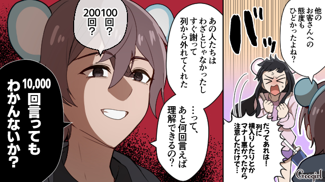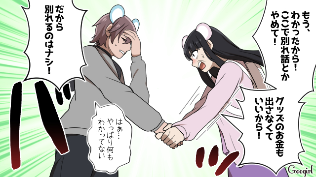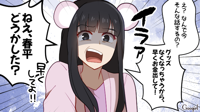 テーマパーク「Gooランド」で数々の迷惑行為をしてきた、害悪オタ美帆乃。彼氏の春平は別れを決意しますが、そこへ美帆乃が「5万ちょうだい」とねだってきます。最初は「可哀想だから……」と帰宅後に別れ話をする予定だった春平ですが、さすがに我慢できずその場で美帆乃を突き放しました。