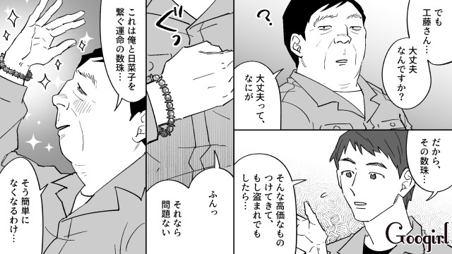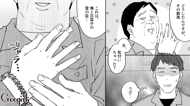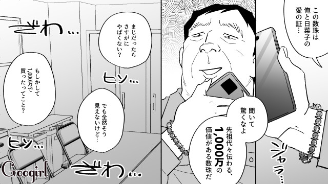 ▽ 京子から譲り受けた1,000万円の数珠を、意気揚々と職場につけていき、大声で自慢をする誠。職場の人間に日菜子を自慢し、上機嫌の誠ですが……。仕事を終えてロッカールームに戻ると、1,000万円の数珠が消えていました。
