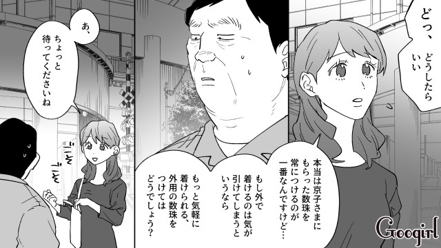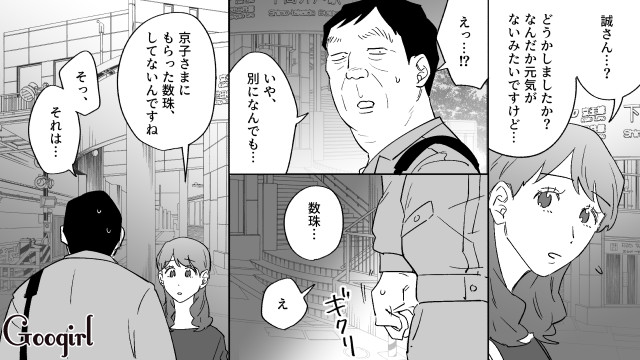 ▽ 京子から譲り受けた数珠を自慢した結果、紛失してしまった誠。そのことを隠して日菜子に相談をすると、なんと50万円の数珠を勧められてしまいました。これはもしかして……。