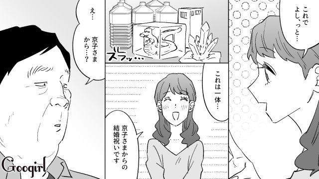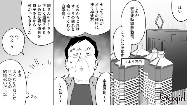 ▽ 同僚たちに結婚を告げ、そしてついに、日菜子を自宅に招いた誠。しかし日菜子の手には、怪しげなオーラグッズが握られていて……。