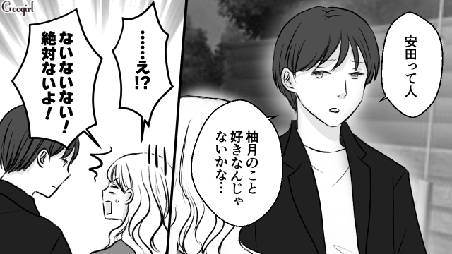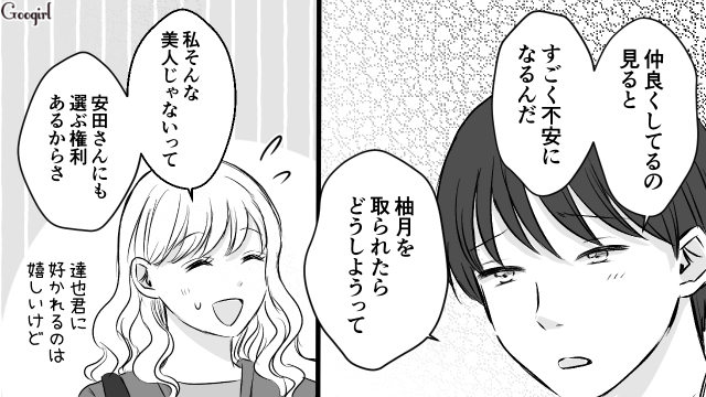 飲み会終わりに、勝手に柚月を迎えに来た達也は、まるで安田に宣戦布告するように彼氏だと宣言します。注目された柚月は、恥ずかしさから「会社関係の飲み会にわざわざ迎えに来なくてもいい」と伝えるものの、達也は「安田は柚月のことが好きなんじゃないか」と言い出して……!?