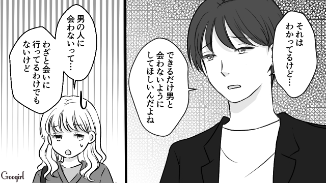 ▽ 「心配だから男になるべく会わないでほしい」と言う達也に、柚月は仕事でも日常生活でも男性を排除して生活することは無理すぎると伝えます。柚月を信じていないわけではなく、ただ自分を大切にしてほしいだけだと達也は言いますが、柚月は少し彼の束縛が強すぎる気がしています。
