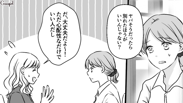 OLの柚月に最近できたイケメンで優しい彼氏・達也は「心配だから男になるべく会わないでほしい」と少し束縛が強すぎます。付き合ってからほとんど達也に時間を使っていたから、寂しさを感じさせてしまったかもしれないと考える柚月。久しぶりに友達と映画に出かけましたが、ちょっとスマホを見ていない間に達也からものすごい数の連絡が来ていました。達也からの電話に恐る恐る出る柚月は、もし一緒にいたのが男なら怒られていたかもと思います。