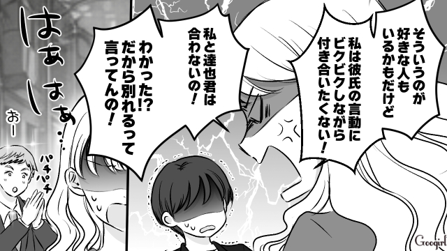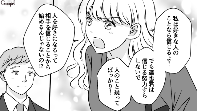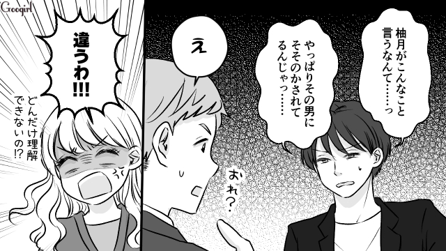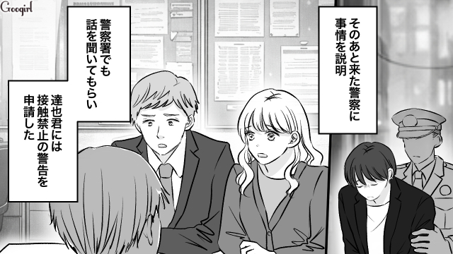GPSを入れて位置情報を確認し合おうとする激やば彼氏・達也に路地裏に連れ込まれてしまう柚月。柚月に電話をかけたはずなのに、繰り返し切られておかしいと思った安田が助けに来てくれました。達也のヤバさに震える柚月を心配する安田ですが、ものともせず柚月は、達也に説教を始めます!