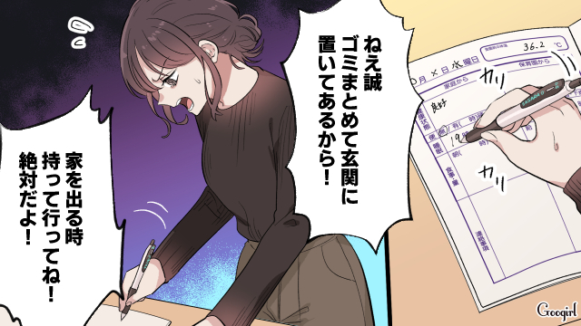 ▽ 「ゴミ捨てておいて」という妻の頼みを、「面倒だから」という理由だけで無視した誠。重い荷物と子供を抱え、さらにゴミまで抱えて出社する美穂子の姿を、想像することすらありませんでした。その上会社では「俺のおかげで家庭円満」と語る誠ですが、果たしてその自認は正しいのでしょうか……?