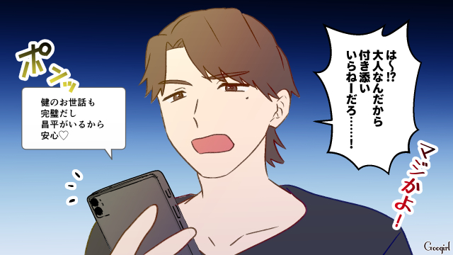 そんな折、母がぎっくり腰になったからと、健を昌平に任せて実家に帰る沙也加。育児にお金も手間もかけたくない昌平は、同僚3人を呼び出し代わりに育児させ、まるで自分が育児していたかのように、沙也加に自撮りを送ります。