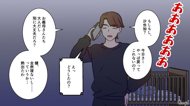 ▽ 「病院に連れて行く可能性があるから」と、沙也加は実家に泊まることになりました。昌平は健を寝かしつけようとしますが、全く寝てくれません。昌平から「熱が出た」と聞いて、慌てて帰ってきた沙也加ですが、泣き腫らしている健のそばで、しんどかったのは自分だと昌平が言い出します。