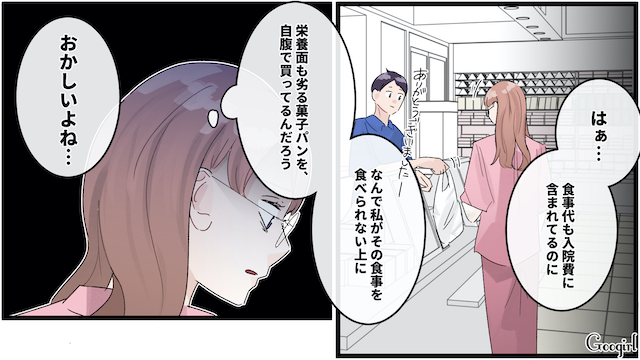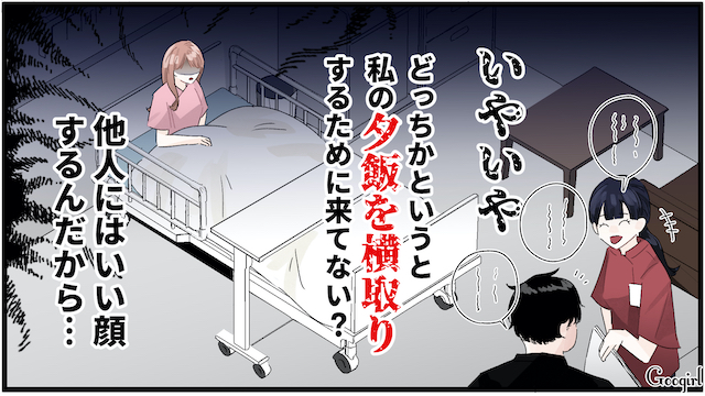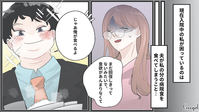 入院という大変な状況のときでも、妻を大切にしてくれる旦那さんばかりとは限りません。中には気遣うどころか、自分のことばかり気にするタイプの人もいるようで……。みずほと英二は結婚2年目の夫婦。あるときみずほが入院することになります。英二がお見舞いに来ましたが、ちょうど運ばれてきたみずほの夕食に手を出してきて……!?