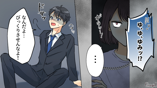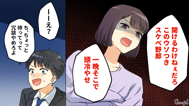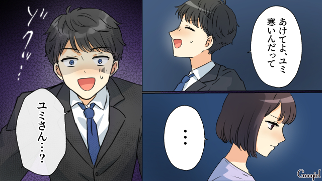 ▽ 自宅から締め出されたカケル。ユミがあれだけ頑張って自分の気持ちを伝え続けていたのに、まともにとりあわなかった報いですね。カケルの自業自得です。