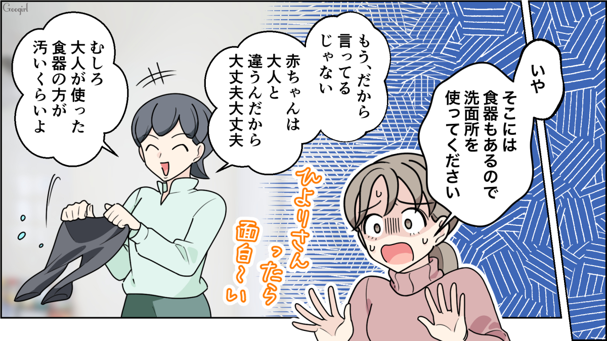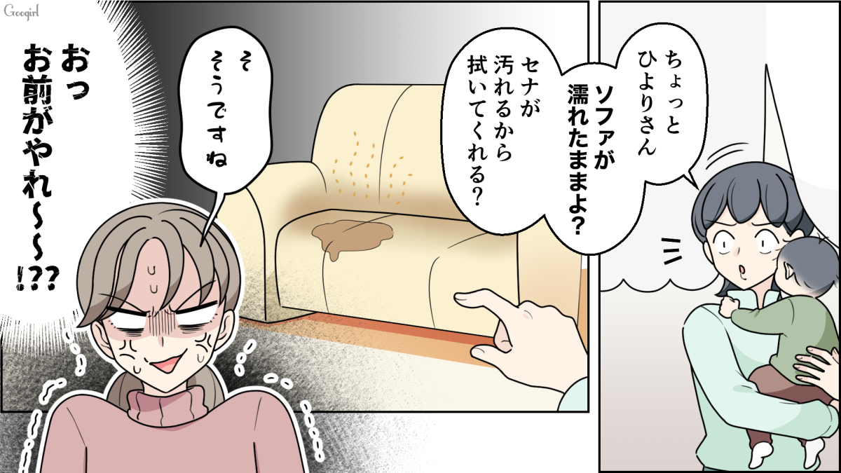 突然ひよりの宅にやってきたのは、同じ社宅に住むヤバいママ友・アキ。ずかずかと上がり込んだと思ったら、アキの息子・セナがソファでおもらしをしてしまいます。慌てるひよりを横目に、なんとアキは、セナのおもらしで汚れた服をキッチンで洗い始め――!?