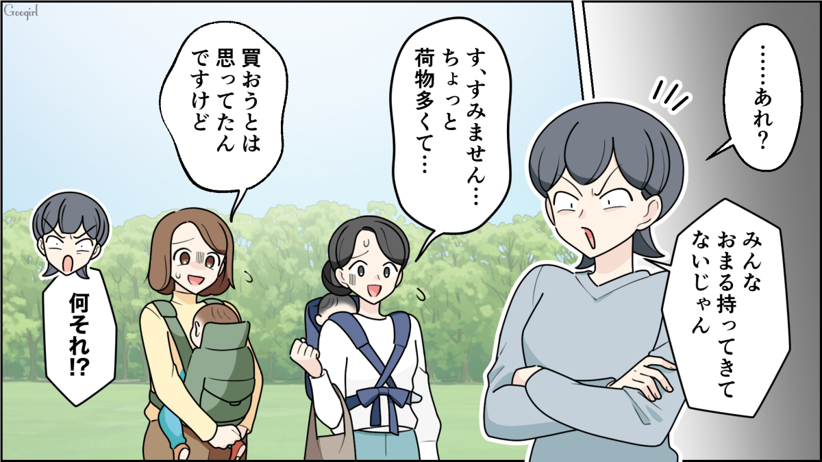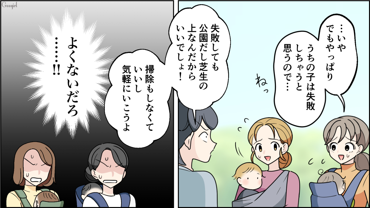 ▽ 当日、公園に集まったママたちは、いつものようにアキの強引なペースに振り回されてしまいます。ひよりは勇気を出し「うちの子はまだオムツで……」と伝えますが、アキは「失敗したって、どうせ芝生の上なんだからいいじゃない」と聞く耳を持ちません。しかしピクニックが始まって間もなく、 場の空気を一変させるある人物が現れ……?