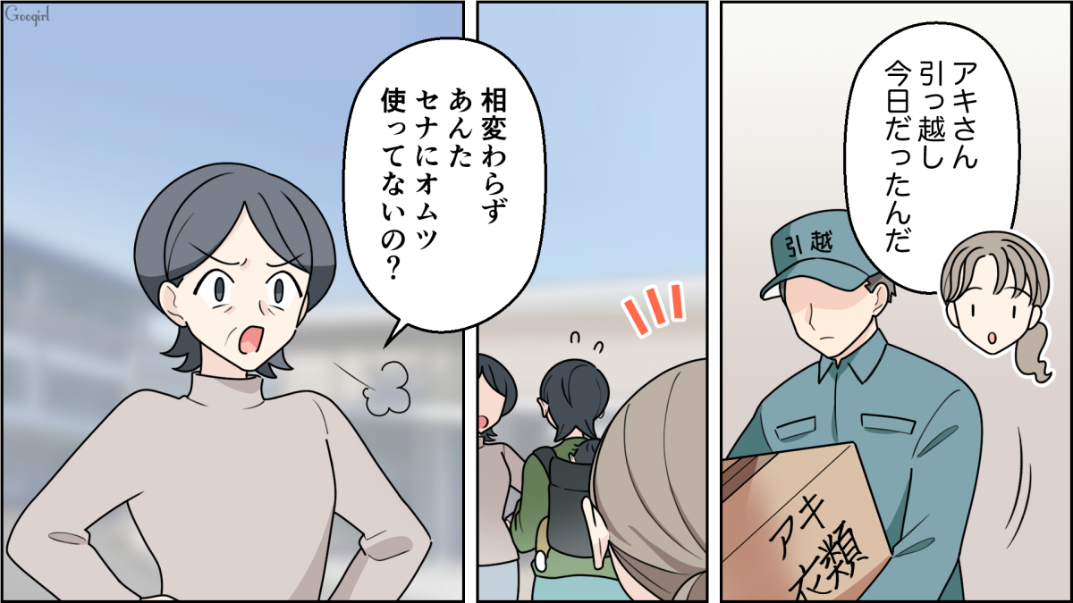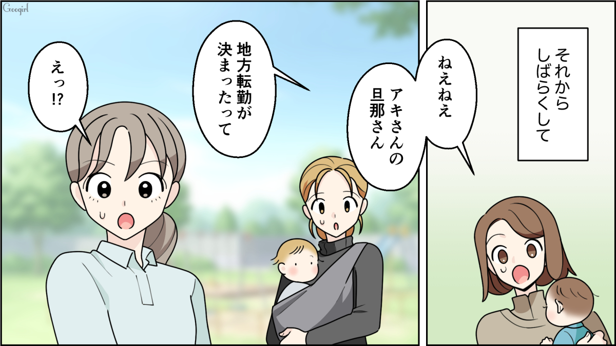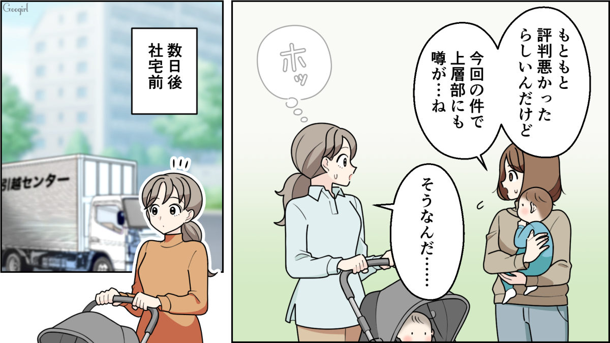 ▽ 広尾の叱責事件をきっかけに、アキの影響力は弱まり、社宅には少しずつ平穏が戻りつつありました。そしてなんとそこへ、追い打ちをかけるように、アキの夫の地方転勤が決定。アキだけでなく夫の評判も悪く、上層部に目をつけられてしまったようですね。そしてついにアキの引っ越しの日、ひよりはアキが誰かと話しているのを見かけます。
