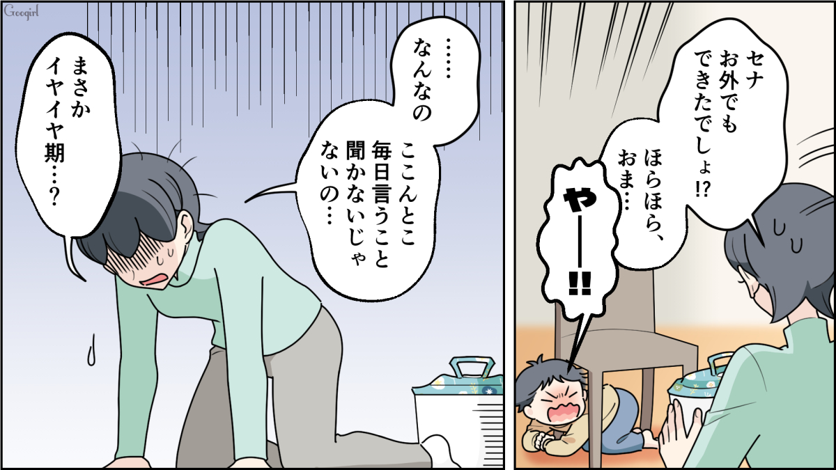 新天地で育児中のアキは、イヤイヤ期に突入したセナに手を焼いている様子。 自信満々だったオムツなし育児は、果たして順調なのでしょうか……? そして社宅のひよりとセナは?
