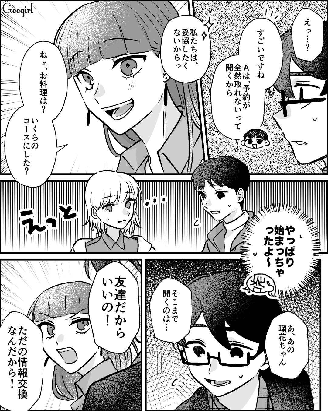 ▽ 一緒にランチをすることになった瑠花は、凪に根掘り葉掘り聞きながら暴走気味です。結婚式場でも負けじとマウントを取りたいようですが……困りものですね。
