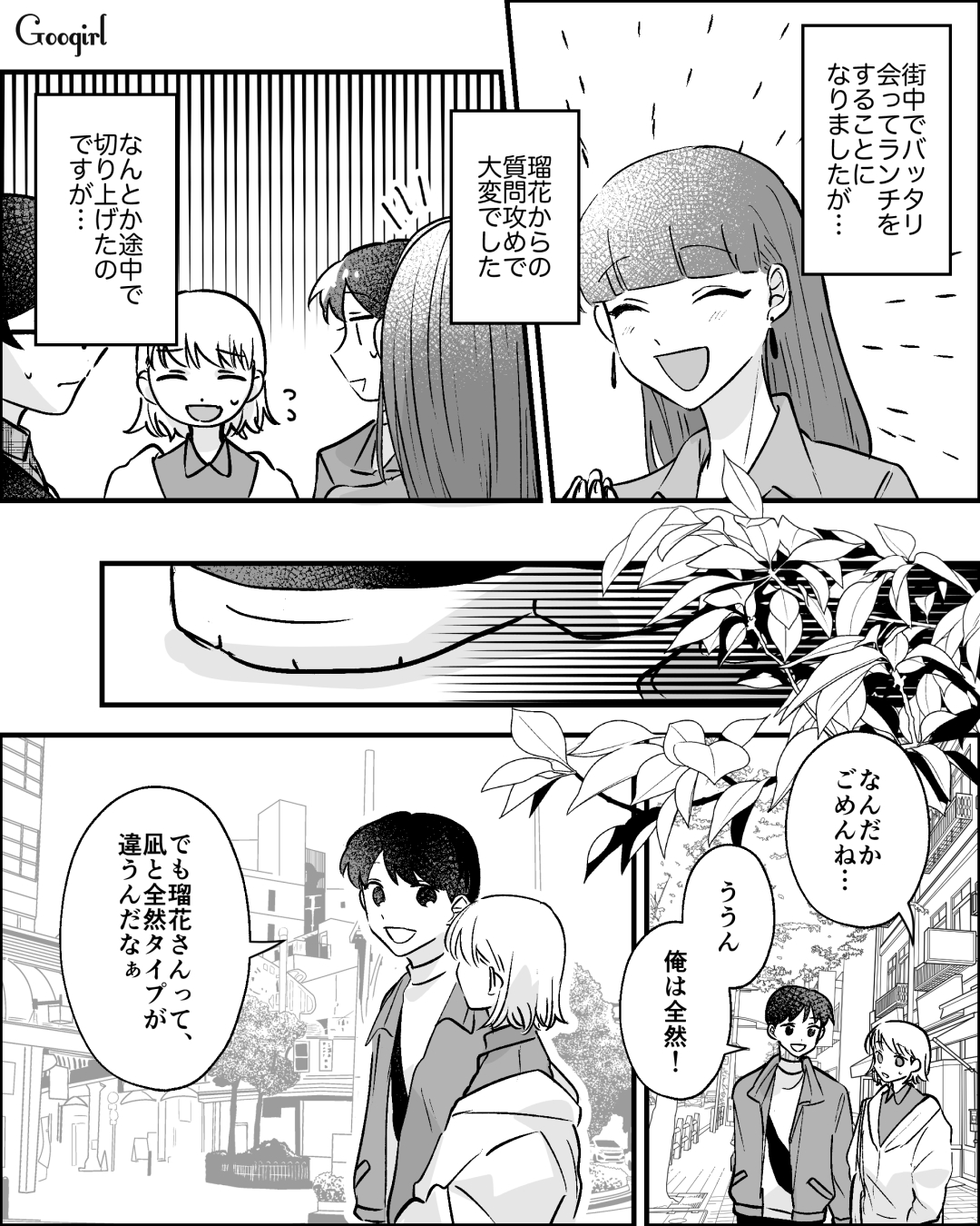 偶然街で瑠花カップルと会い、ランチをすることになった凪と智久。瑠花のマウントが炸裂していましたが、智久はどう思っているのでしょうか……?