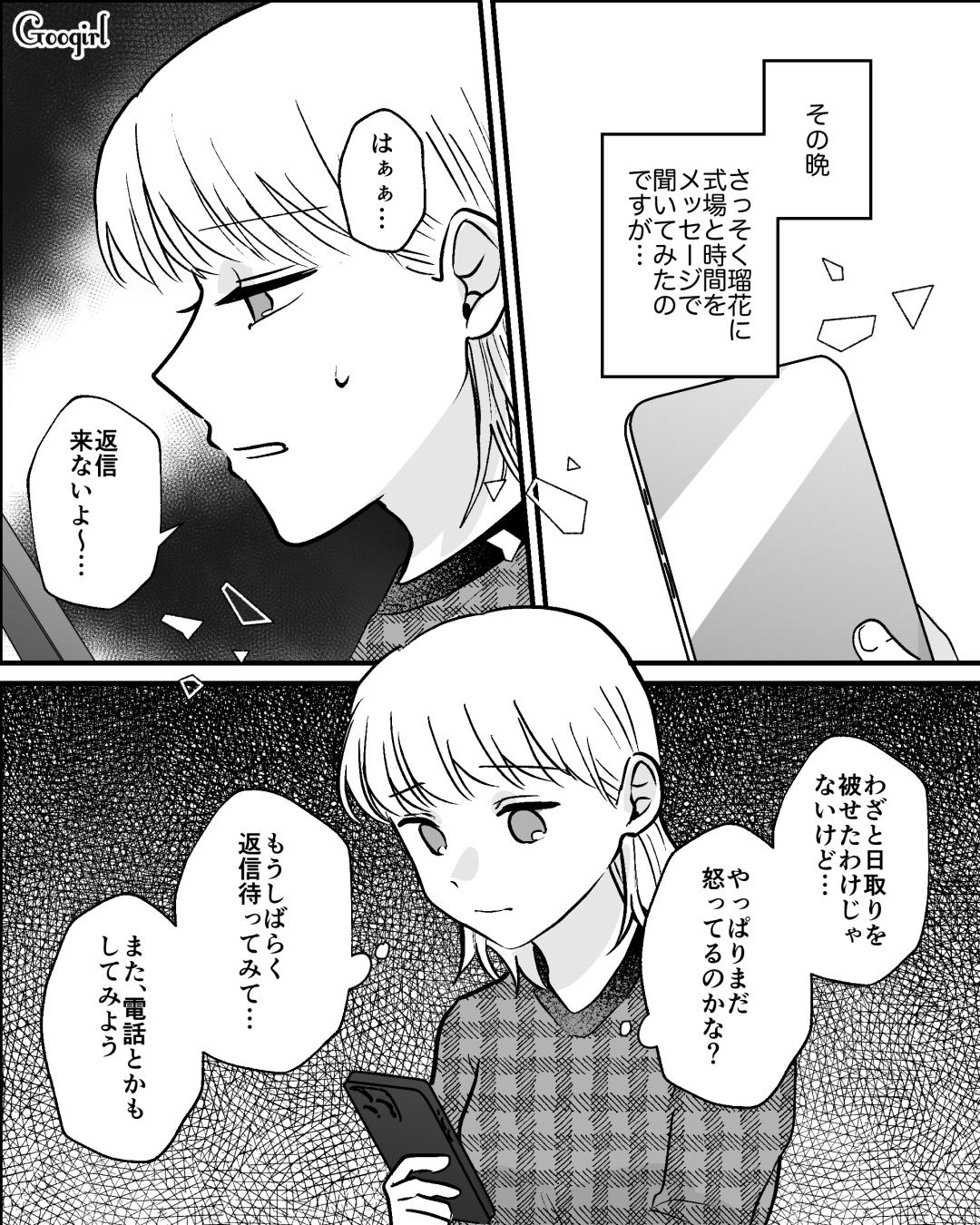 瑠花と結婚式が被っていることが分かった凪。友人たちは瑠花の話を信じていないようですが、凪は信じていて……。真実はどうなのでしょうか?