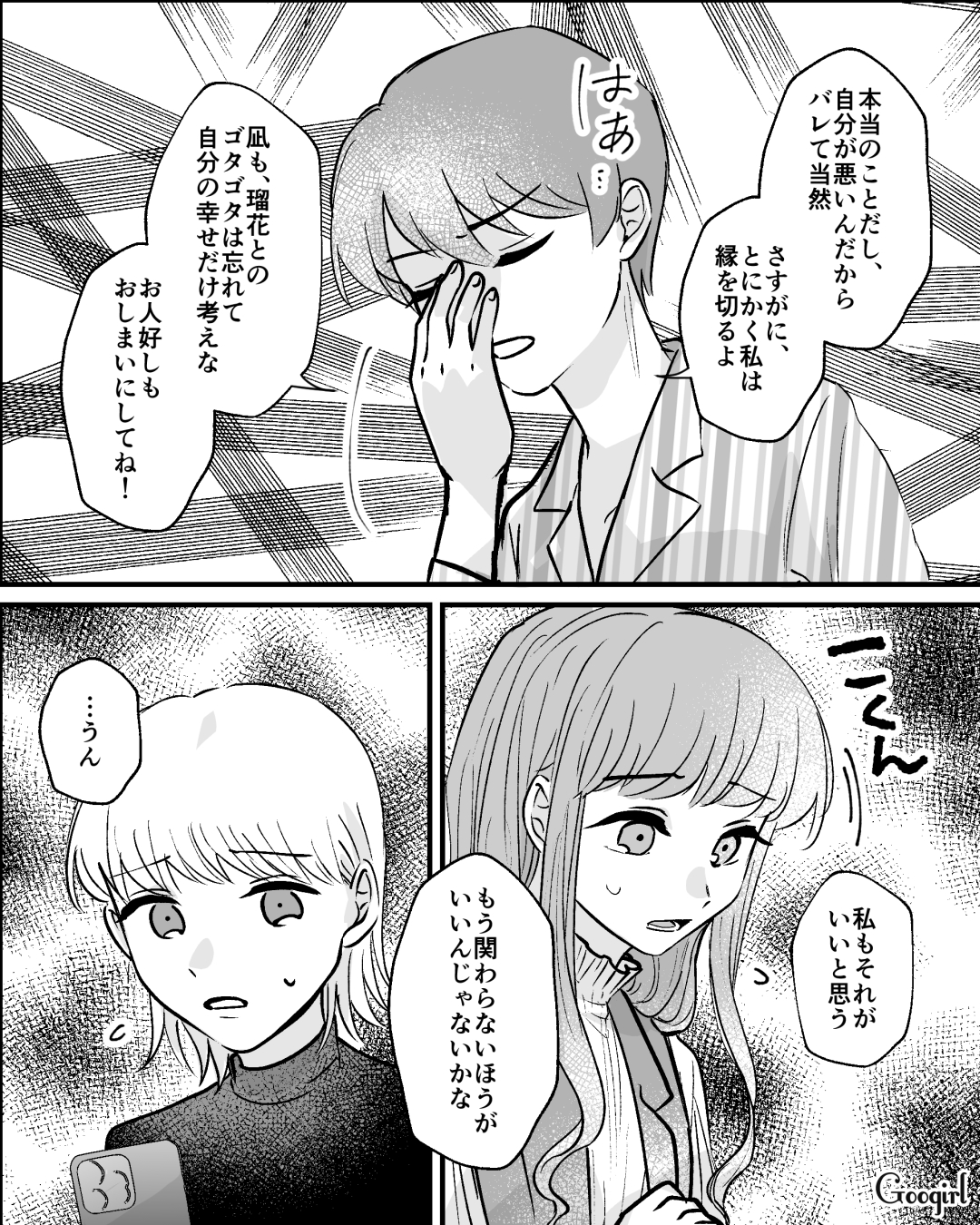 瑠花は、婚約者に見限られ、すみれにも嘘がバレてしまいました。凪もレナもその報告を聞いて……。「『言ったつもりだった』結婚式の日取りを“偶然”かぶせてきた友人の話」第14話、お楽しみください!