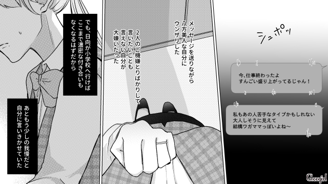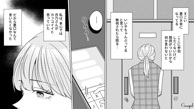 ▽ 仕事終わりにスマホを見てウンザリする香澄。LIMEでは月乃の悪口で沙羅と夏美が盛り上がっています。そこに入りたくないと思いつつ、嫌われたくなくて自分も悪口に参加する香澄。モヤモヤが止まらない様子です。