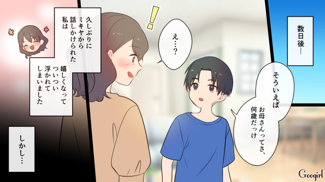 ▽ 久しぶりに息子から話しかけてくれたかと思ったら、おばさんじゃんと言われてショックを隠せないアユミ。息子を愛する気持ちに年齢は関係ないと思うのですが、それはまだ、ミキヤには分からないようです。