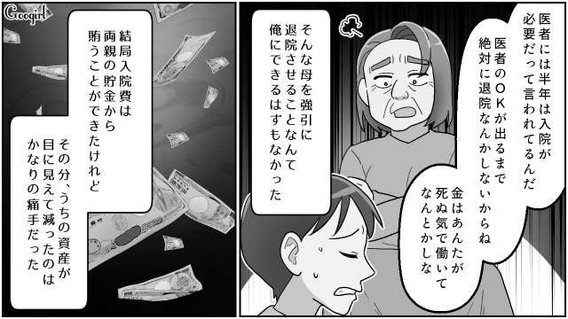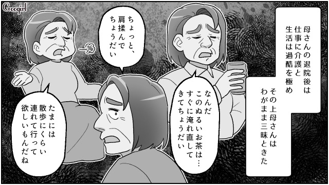 ▽ 職場では左遷され、金銭的にも余裕はなく、家に帰ればわがままな母の介護が待っている。まさに生き地獄ですね。