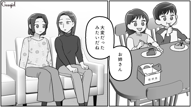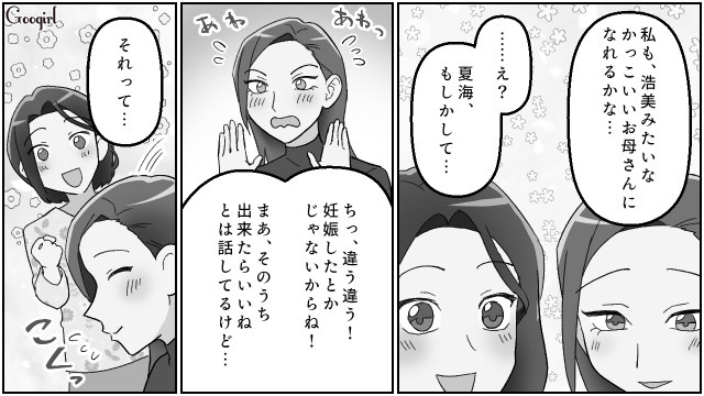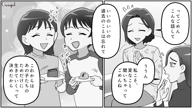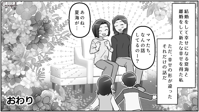 ▽ 幸せそうに結婚報告をする夏海と、離婚をしてすっきりとした様子の浩美。幸せの形は、ひとつではありません。