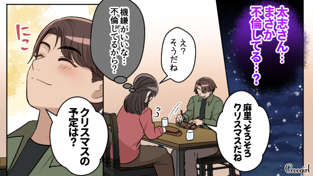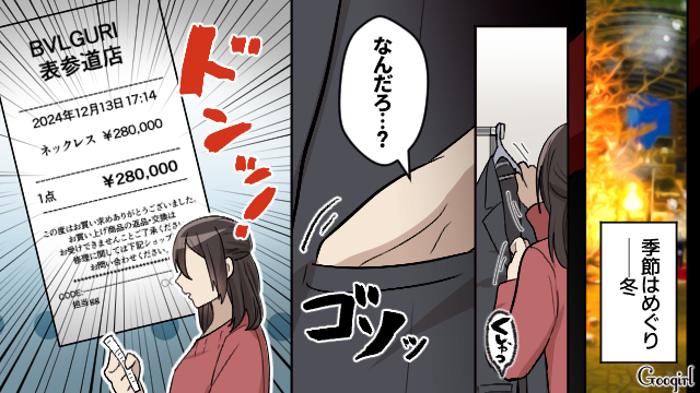 ▽ クリスマスの季節に太志のポケットから出てきた高額なレシート。やたら機嫌のいい太志を見て、麻里は自分へのクリスマスプレゼントだと期待しているようです……。