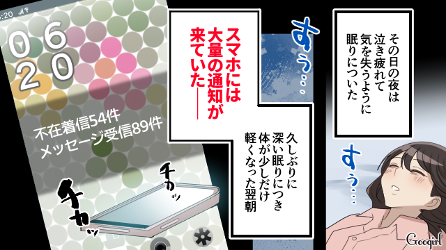 ▽ やっと安心して眠れた麻里。気持ちよく迎えられたはずの朝でしたが、麻里のスマホには不穏な通知が大量に届いているようですね……。