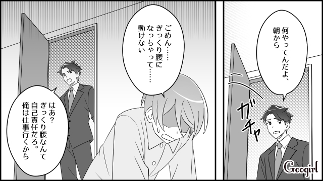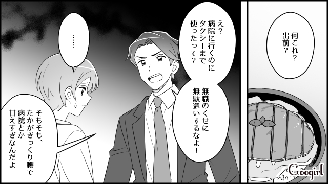 ▽ 育児と家事、寝不足に追われる中で、真紀の体はついに悲鳴を上げました。それでも夫の俊夫は「ぎっくり腰なんて自己責任だ」と言い放ち、助けるどころかお金の使い道に文句を言う始末。真紀は悔しさに唇を噛みますが、自分に収入が無いのは事実だと感じ、言い返すことができません。