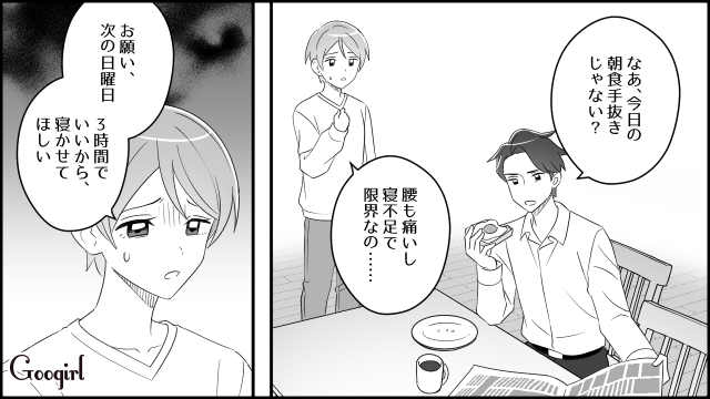 ぎっくり腰の痛みは少し和らいだものの、寝不足と貧血で体は限界の真紀。勇気を出して夫に「少し休ませて」とお願いする真紀でしたが、その願いは聞き入れてもらえるのでしょうか?