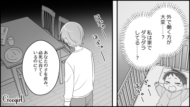 ▽ 体も心も限界を迎えた真紀は、ほんのわずかな休息を求めて夫に助けを求めました。しかし、返ってきたのは「今すぐ俺と同じだけ稼げるなら代わってやるよ」という、冷たく突き放す言葉。その一言が、真紀の胸に深く突き刺さります。そして真紀は、家でできる仕事を探し始めます。