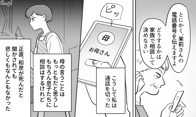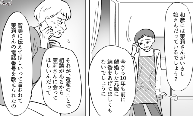 ▽ 離婚したとは言っても、2人の息子が和彦の子供である事実は変えられません。遺産相続の権利が息子達にある以上、無視するわけにもいかない智美。会いたくない茉莉に、会う決意をするのでしょうか?