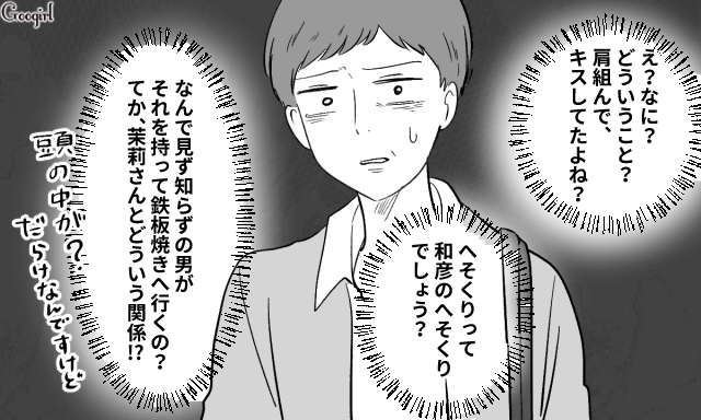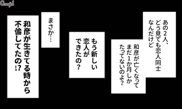 ▽ 会社から出てきた茉莉と見知らぬ男性。茉莉はカフェで会った時とは別人のように派手な化粧をして着飾っています。どう見ても恋人同士に見える2人ですが、和彦が死んでまだ1か月、新しい恋人だと言うには早すぎませんか!?