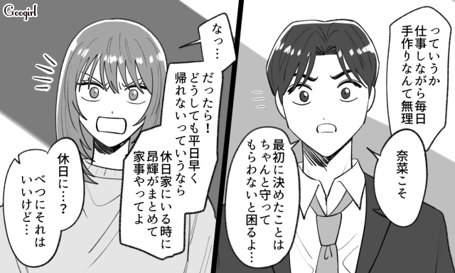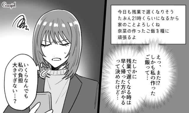 ▽ 奈菜の仕事が忙しくなるのと同時に、昂輝も残業が続き、奈菜一人で帰ってからの家事をこなす日々が続きます。限界を感じて昂輝に交渉をする奈菜ですが、昂輝からは思いがけない答えが返ってきます。