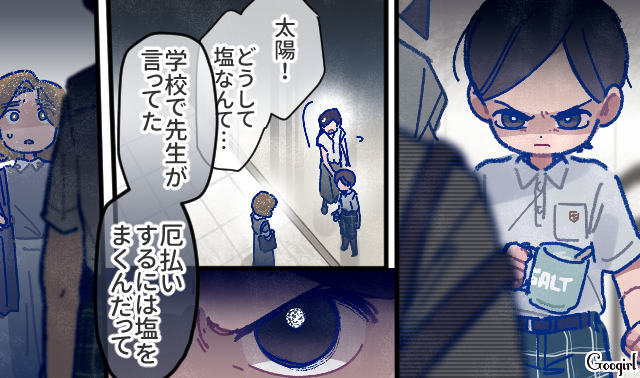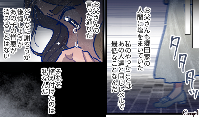 ▽ 学校から帰宅した太陽と鉢合わせてしまった美幸。塩をかけられ、郷田家の人間に激怒した父と太陽を重ね合わせ、さらには自分と郷田家の人間が同じレベルで最低だと気付きます。