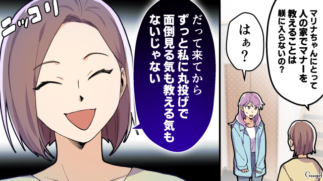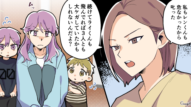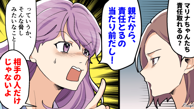 危険な行動を叱るミキに対し、マリナとアツシは「家庭方針に口を出すな」と逆に注意し、「子どもがいない人にはわからない」と話をすり替えてきました。